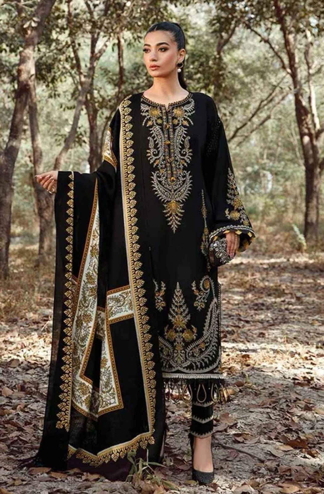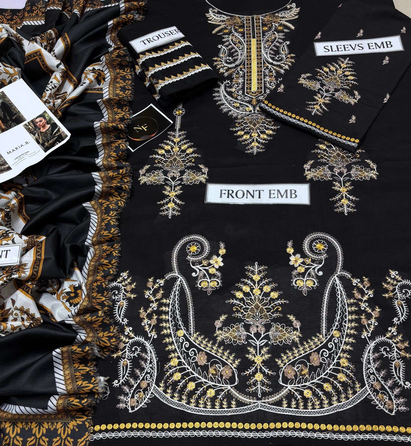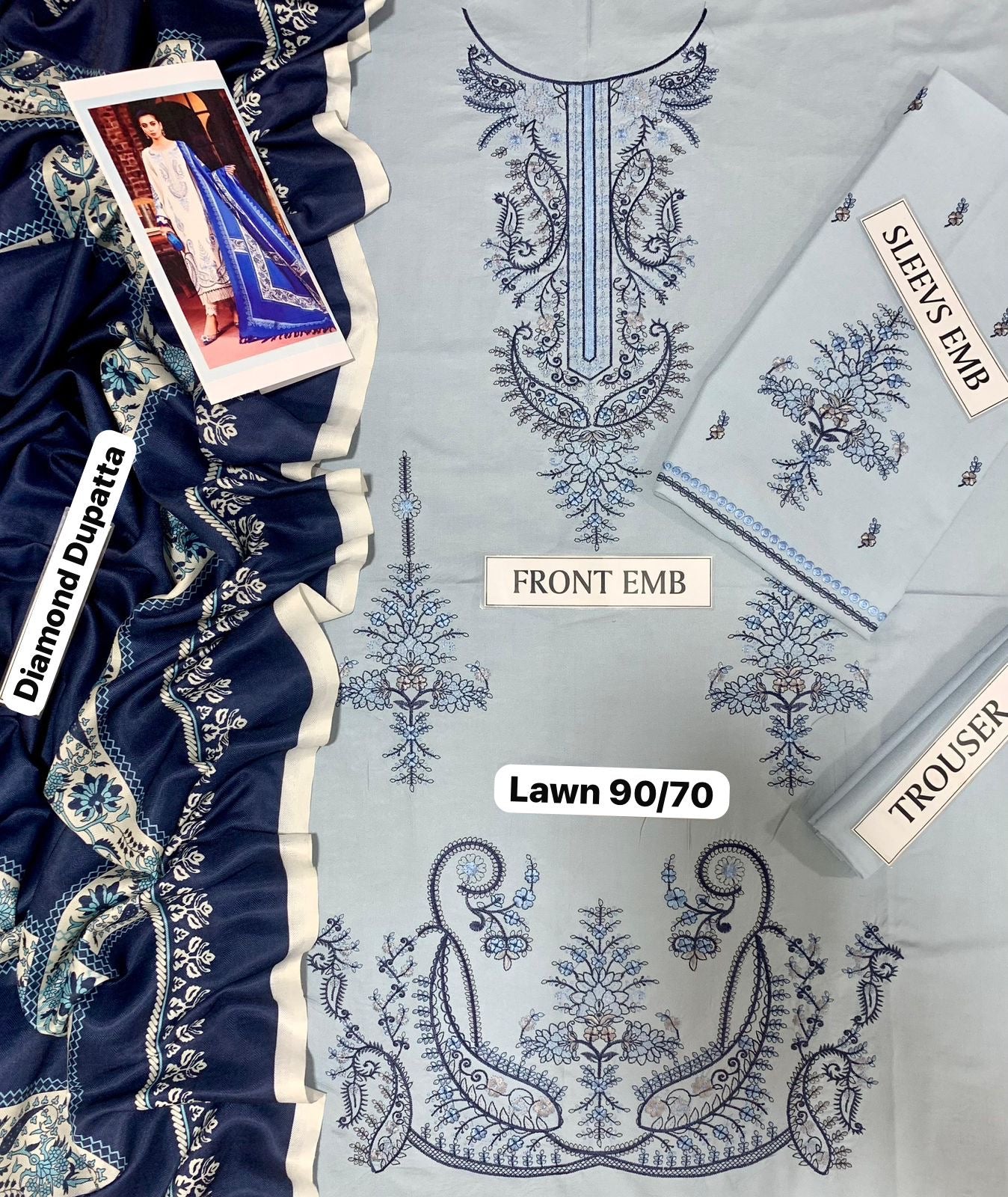 *DESCRIPTION* 3PC EMB SUITS *FRONT* FULL HEAVY EMBROIDED *NECKLINE* EMBROIDERED *DAMAN* EMBROIDERED *BACK* PLAIN *SLEEVES* HEAVY EMBROIDED*TROUSER* PLAIN*DUPATTA* DIGITAL PRINTED DIAMOND MONARK DUPATTA